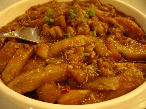 ↓ 肉末茄子:削皮的茄子較軟,易入口;