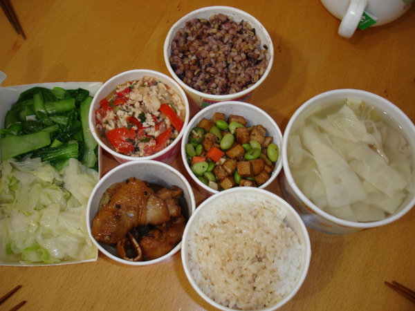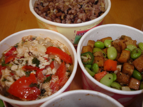 ↓ 辣味打拋雞肉(左邊)+豆乾炒毛豆(右邊)+五穀飯(上面)