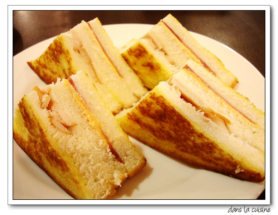 上下最外層白吐司沾蛋液煎過,類似 French toast 的做法,