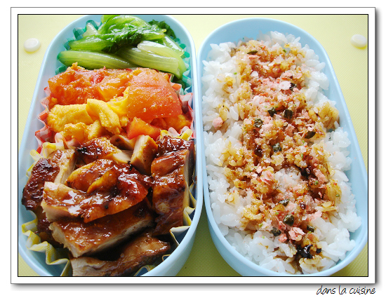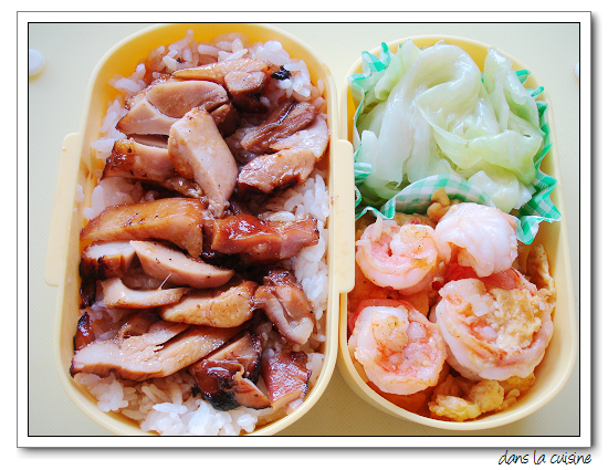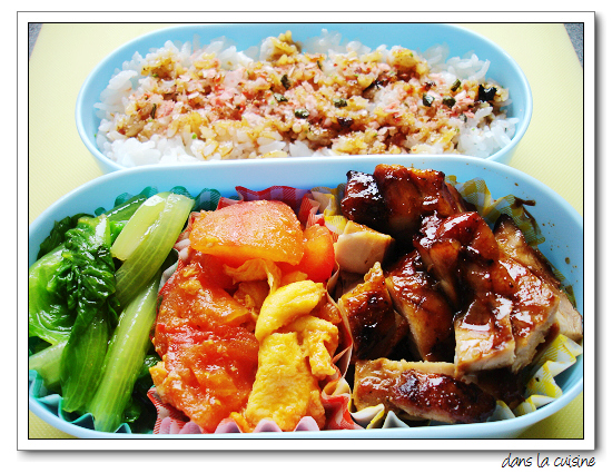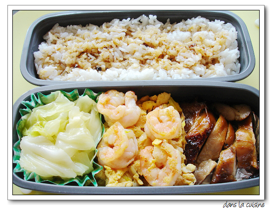 ↓ 2010.04.01.小孩版:照燒雞腿+炒高麗菜+滑蛋蝦仁
