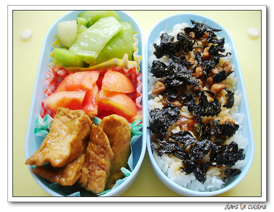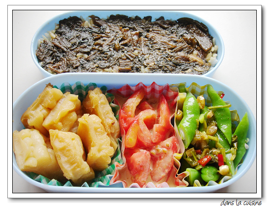 ↓ 2010.04.09.:紅燒梅干菜+紅燒苦瓜+去皮番茄佐焙煎胡麻醬+