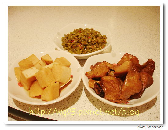 ↓ 小菜三碟(贈送):醃白蘿蔔(左)→豇豆(中)→麵腸(右)