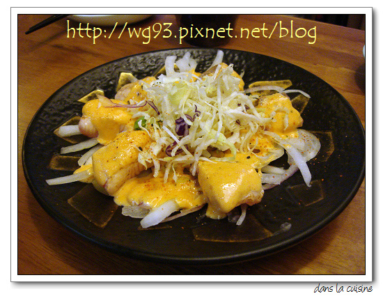 ↓ (2) 生鮭魚塊佐明太子美乃滋和生洋蔥絲